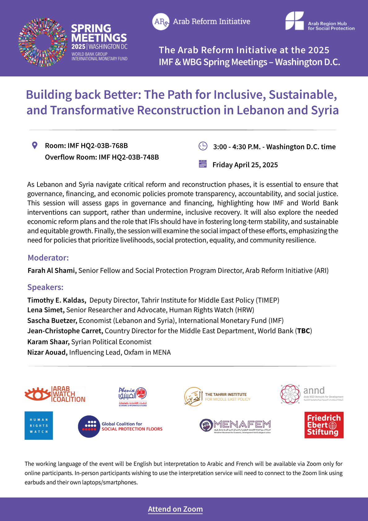 Session's Abstract: As Lebanon and Syria navigate critical reform and reconstruction phases, it is essential to ensure that governance, financing, and economic policies promote transparency, accountability, and social justice. This session will assess gaps in governance and financing, highlighting how IMF and World Bank interventions can support, rather than undermine, inclusive recovery. It will also explore the needed economic reform plans and the role that IFIs should have in fostering long-term stability, and sustainable and equitable growth. Finally, the session will examine the social impact of these efforts, emphasizing the need for policies that prioritize livelihoods, social protection, equality, and community resilience.